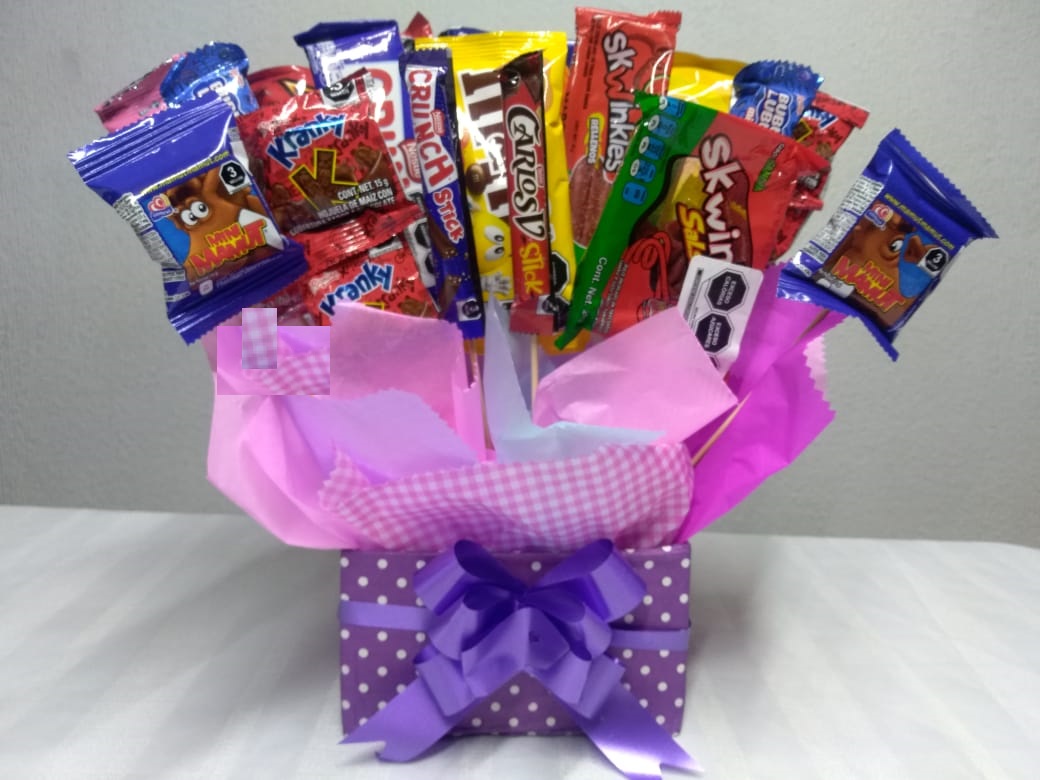 Delicioso arreglo de dulces, con dulces deliciosos, chilositos y chocolatosos que incluye 15 pzas !