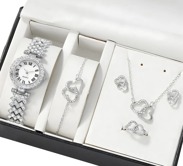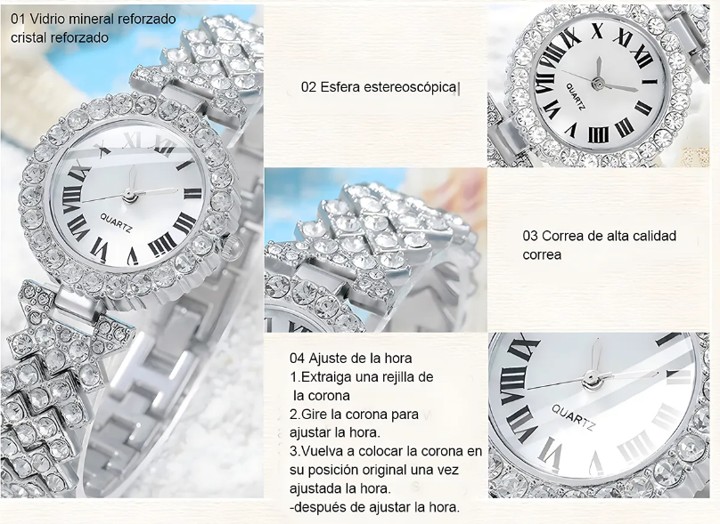1 reloj de pulsera, 1 collar, 1 pulsera, 1 par de pendientes, 1 anillo, todo en una hermosa caja de regalo (el estuche puede variar al de la foto), realizado en acero inoxidable y vidrio reforzado con minerales, esfera estereoscópica y correa de alta calidad.