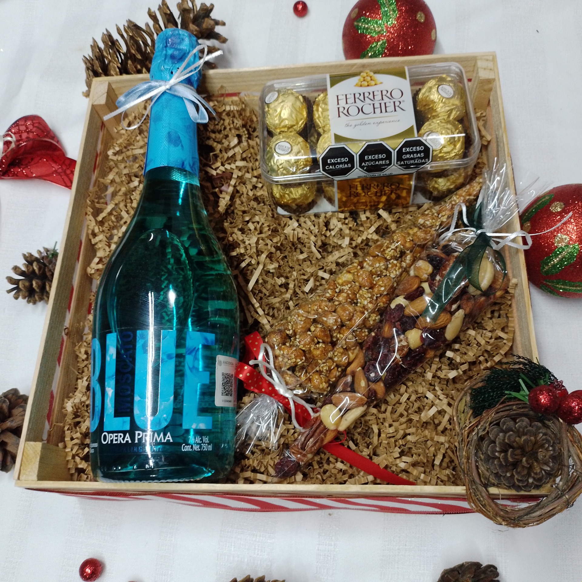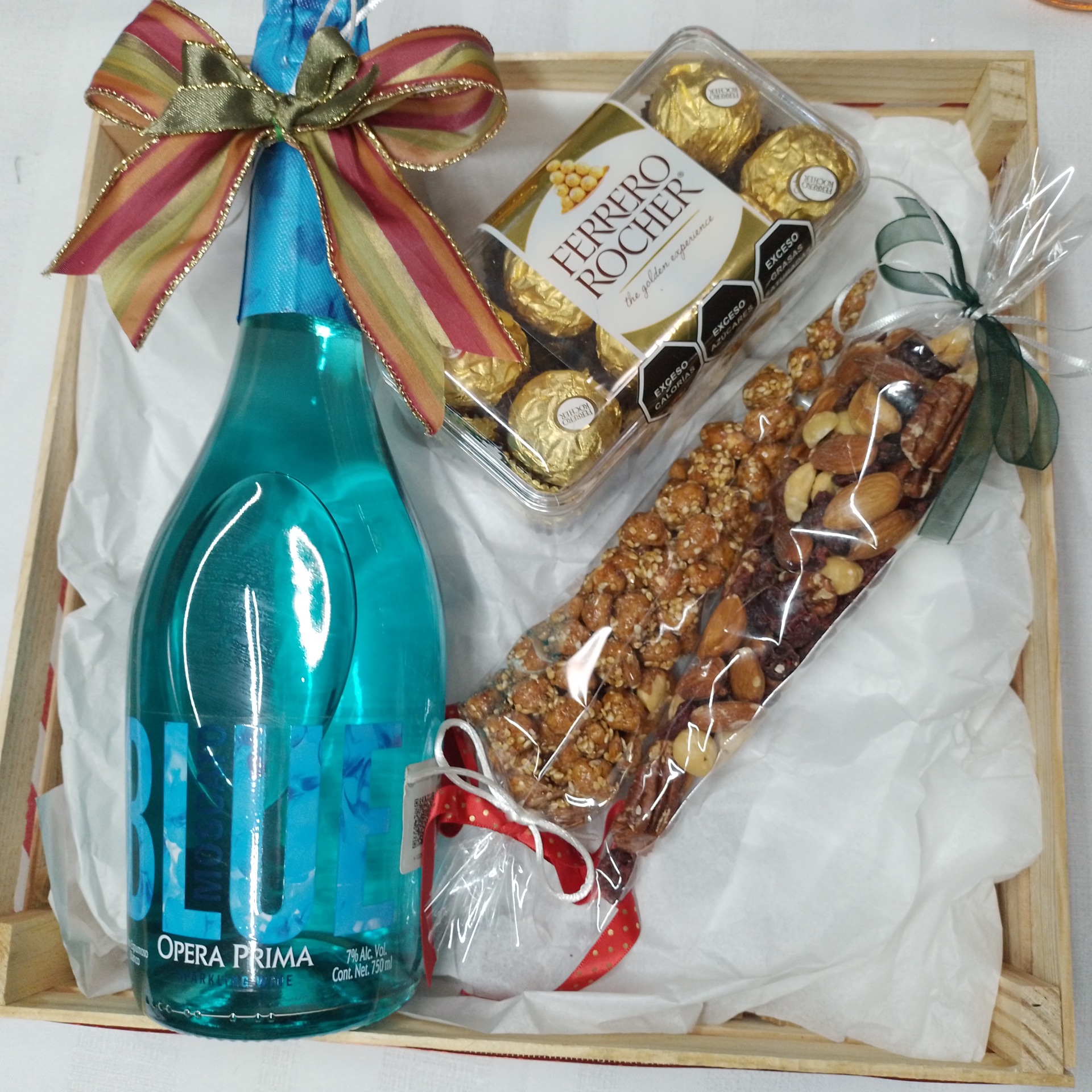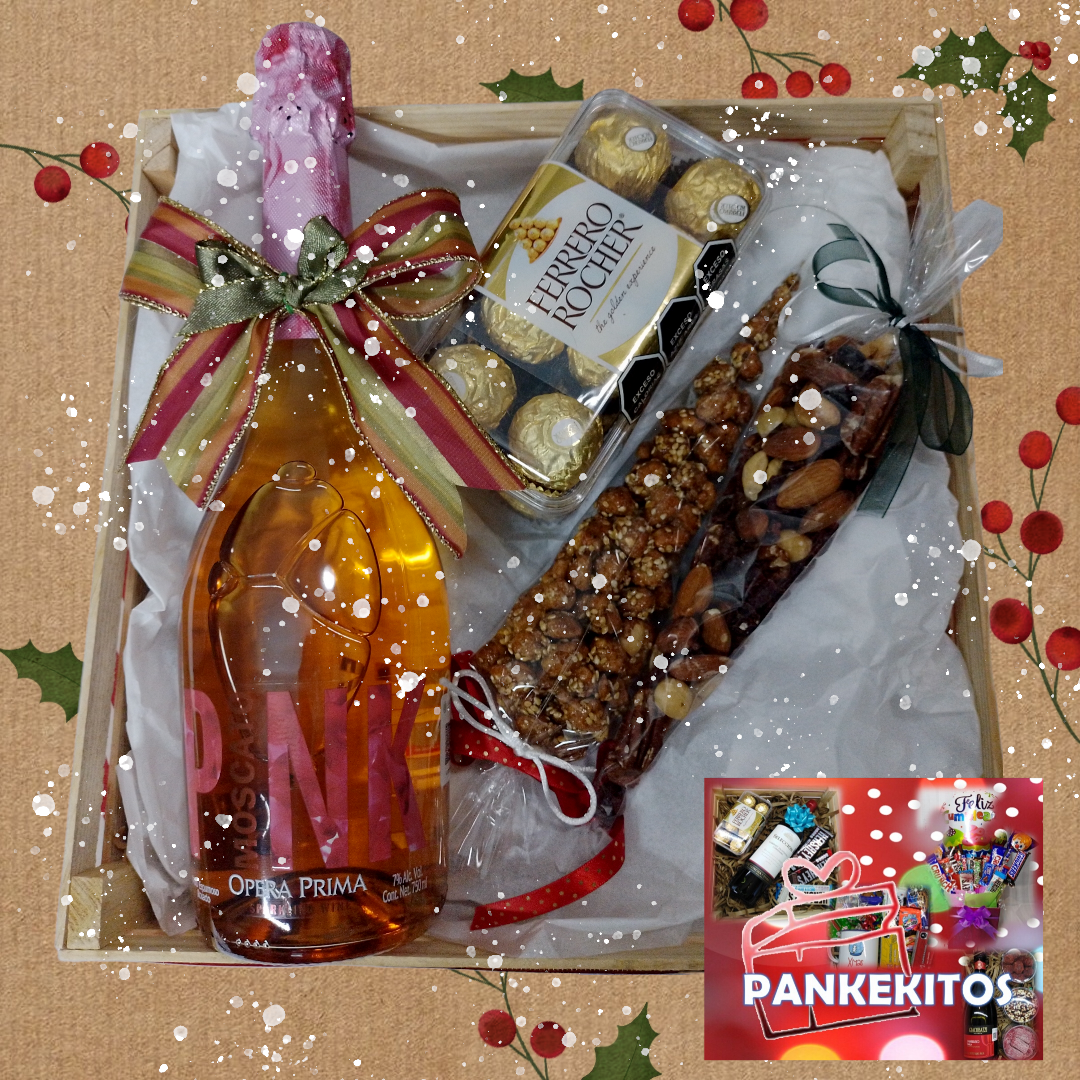 Hermoso regalo que incluye un delicioso Moscato Pink o Blue, a tu elección, 1 Blister de 16 pzas de Ferrero Rocher y 2 bolsitas de botanas selectas que pueden ser: Nueces, Kisses, Ferrero´s, nueces garapiñados, Trufas de chocolate Pankekitosmx, etc.